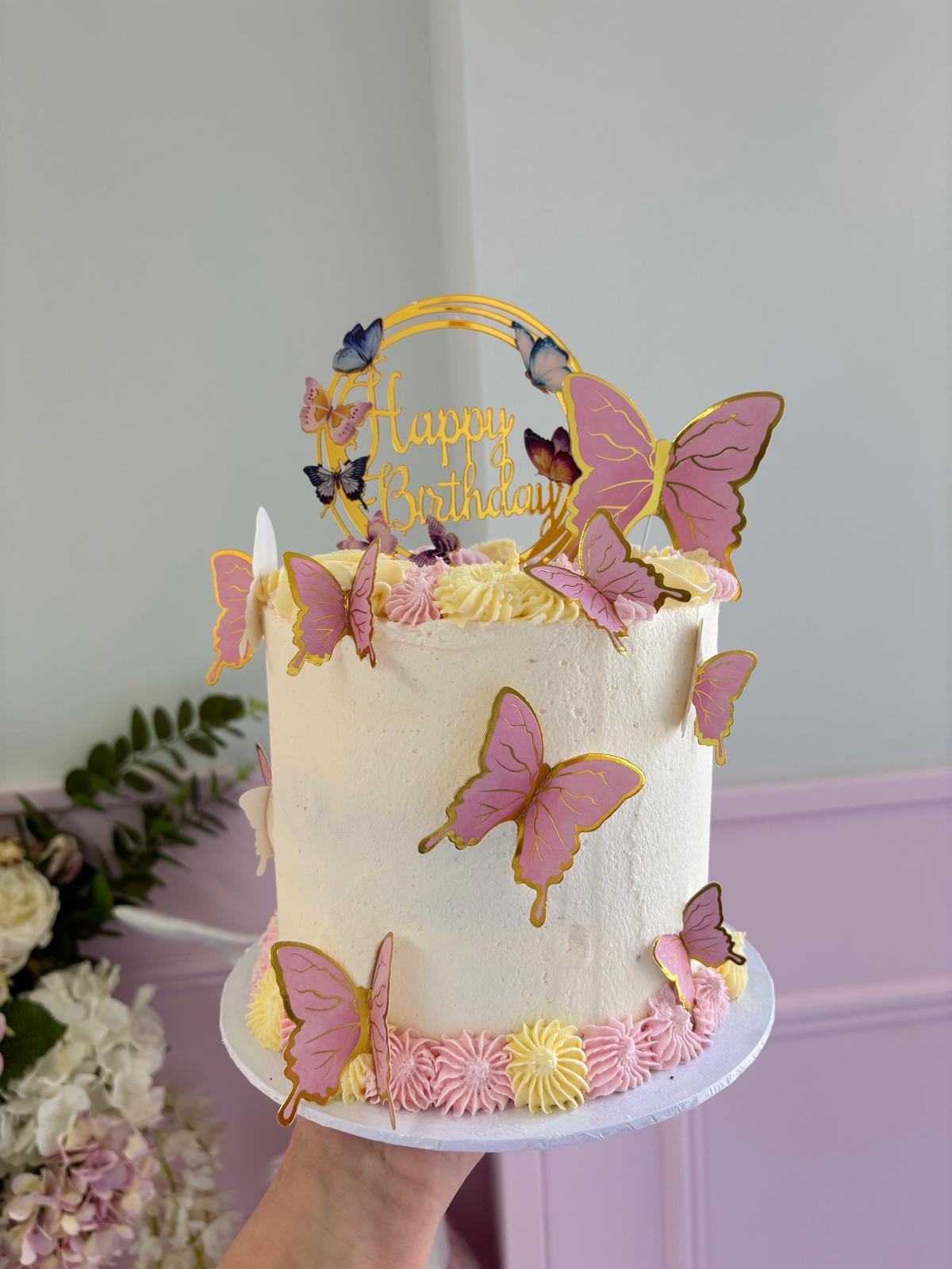 Celebrate in style with this exquisite butterfly-themed birthday cake! Covered in smooth, creamy frosting, this tall cake is adorned with delicate pink and gold butterfly toppers that seem to flutter gracefully. Beautifully piped pastel rosettes in pink and yellow encircle the base, adding a touch of elegance and charm. The golden "Happy Birthday" topper creates a stunning focal point, making this cake perfect for any special occasion. Ideal for lovers of nature-inspired designs, this cake combines sophistication and sweetness in every bite.